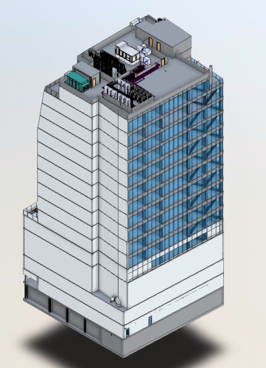 Mid‑rise tower with constructible rooftop MEP plant and façade details.