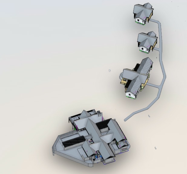 Cluster of cottages along a winding drive. Massing, setbacks, circulation.